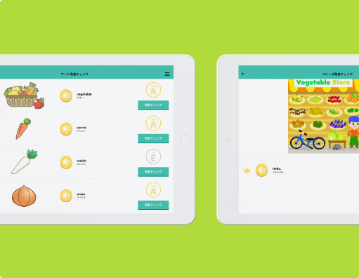 話す・聞く・読む・書くの4技能に対応!  豊富で楽しい復習教材♪レッスン以外の時間にも英語4技能を伸ばし、レッスンの復習ができるように豊富な教材をご用意しています。レッスンで練習した話す・聞く力を、AIを用いた発音チェックで復習したり、アプリ教材で読み書きに挑戦したり、子どもたちが楽しみながら利用することが可能です。 アプリ紹介